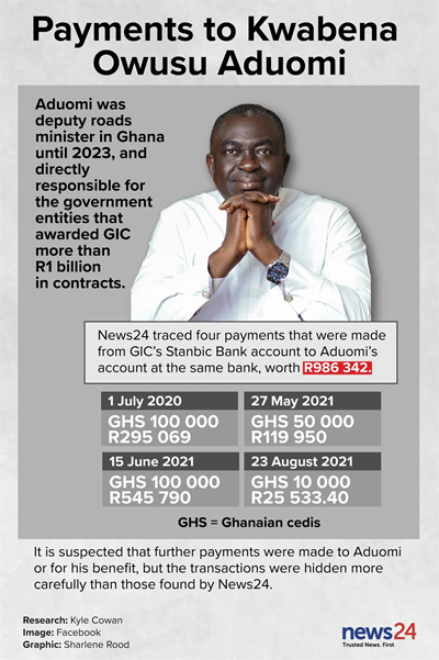 While it is suspected that more money flowed to Aduomi, records seen by News24 confirm 390 000 Ghanaian cedis (about R986 000) was paid directly to his bank account from the Singhs’ company in that country, GIC.